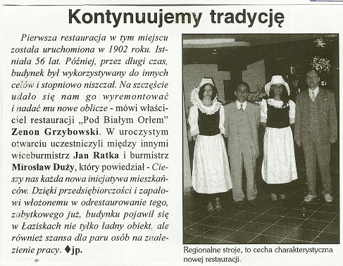 W maju 2003 roku nastąpiło uroczyste otwarcie restauracji "Pod Białym Orłem". W uroczystości wzięli udział przedstawiciele Urzędu Miasta Łaziska Górne, między innymi ówczesny wiceburmistrz Jan Ratka i burmistrz Mirosław Duży. Oprócz tego zjawiło się sporo mieszkańców Łazisk Górnych, zaciekawionych nowym przedsięwzięciem oraz przedstawiciele lokalnej prasy, dzięki której otwarcie zostało udokumentowane w postaci krótkiego artykułu w "Gazecie Łaziska".